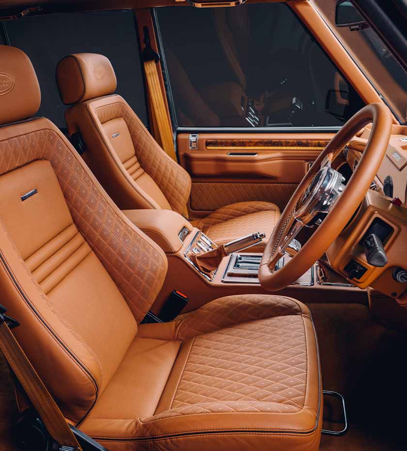 Det er nemlig under motorhjelmen og i kabinen, at de helt store forandringer er sket. Alt er skiftet: Der er riflet, lyst træindlæg og læder overalt. Hvor der er behov for kontrast, har valnøddetræ erstattet det gamle finér. Alle instrumenter og gearskifter, håndtag til at styre højde over vejen, håndbremse, indvendige dørhåndtag, ja, selv låsene, er fremstillet i hånden og med stor akkuratesse tilpasset bilen. Og så har vi slet ikke nævnt en detalje som tæppesæt i 100 procent lammeuld. Det er den slags detaljer, der er med til at gøre en ordinær firehjulstrækker til en femstjernet oplevelse.